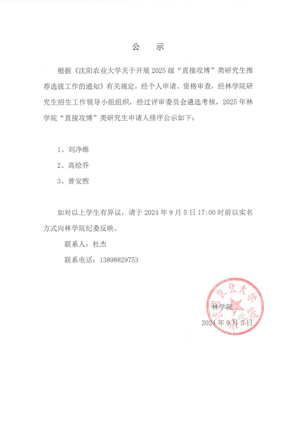 林学院2025级“直接攻博”类研究生申请人排序公示