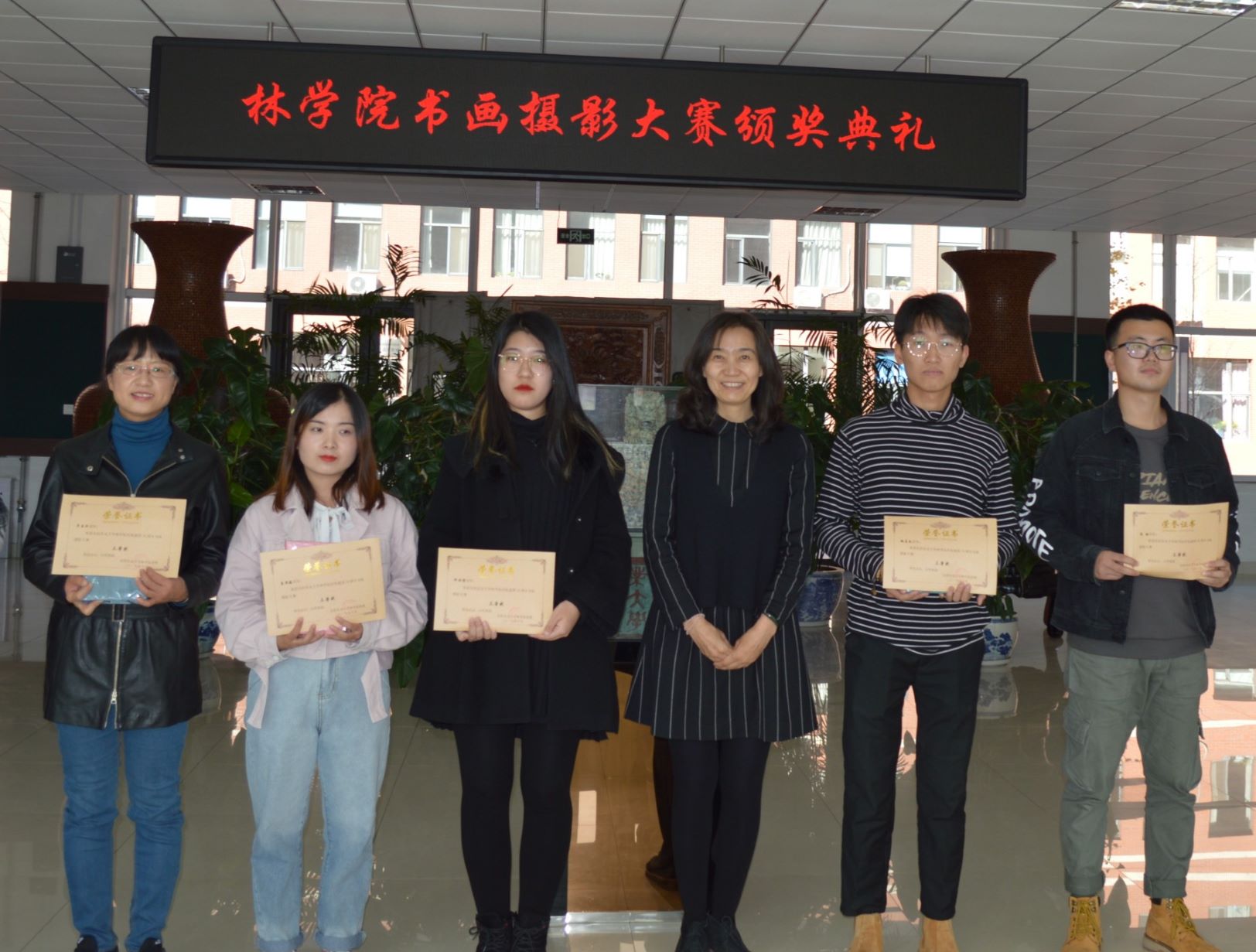 本次活动历时12天在沈阳摆渡仁教育咨询有限公司的大力支持下全院师生积极响应,截止9月24日共收到师生书画摄影作品70余件。这些作品种类丰富多彩视角新颖独特,气韵生动传神意境广阔深远 林苑师生用他们追求美的笔触和探索艺术的镜头,回顾我国70年来取得的巨大变化与发展表达了他们对党和国家的热爱与称赞,也寄托了他们对祖国明天的美好祝愿。9月25日,书画摄影大赛优秀作品评选活动在林学楼308圆满召开。经过专业老师的层层评审,最终26幅作品脱颖而出,共评出书法、绘画、摄影3个大类、9个项目的奖项。10月31日,书画摄影大赛颁奖典礼在林学楼大厅圆满举行