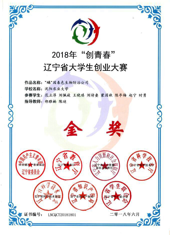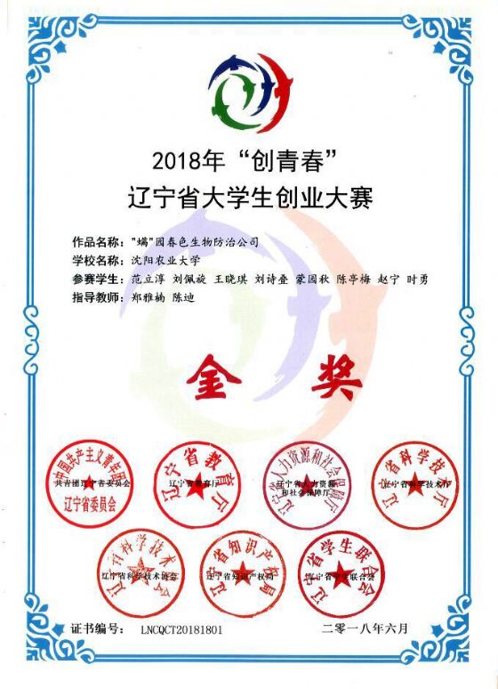 近日,2018年“创青春”辽宁省大学生创业大赛落幕,林学院森林保护学科郑雅楠老师指导范立淳、刘佩旋、王晓琪、刘诗叠、蒙园秋、陈亭梅、赵宁、时勇8位同学完成的参赛作品“‘螨’园春色生物防治公司”,脱颖而出荣获金奖,将代表辽宁省参加全国比赛。