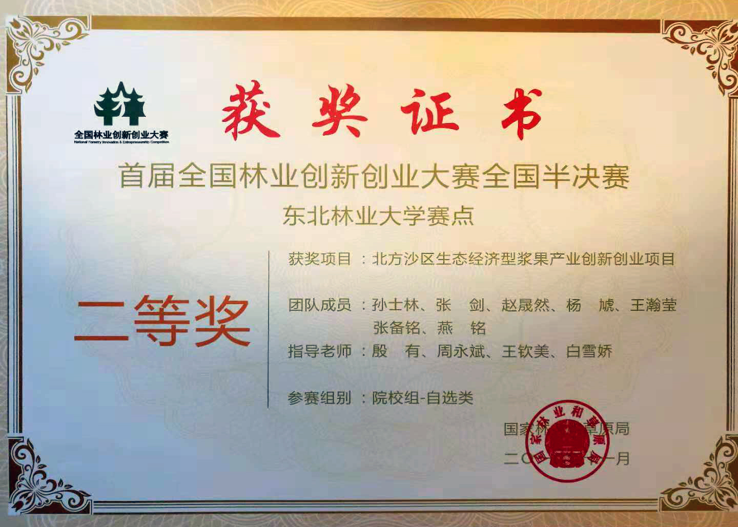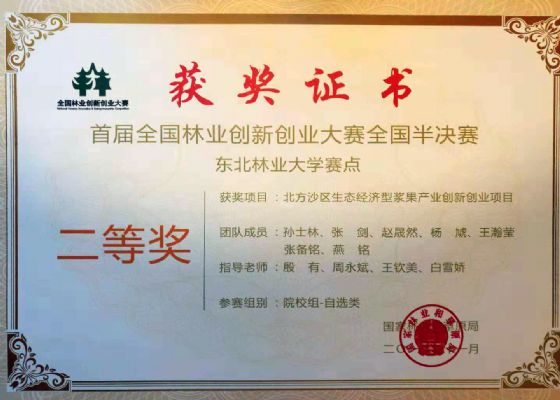 近日,乐动(中国)教师殷有、周永斌、王钦美、白雪娇4位老师指导孙士林、张剑、赵晟然、杨虓、王瀚莹、张备铭、燕铭等同学完成的作品《北方沙区生态经济型浆果产业创新创业项目》,在国家林业和草原局举办的“首届全国林业创新创业大赛”中荣获全国半决赛二等奖、总决赛优胜奖。