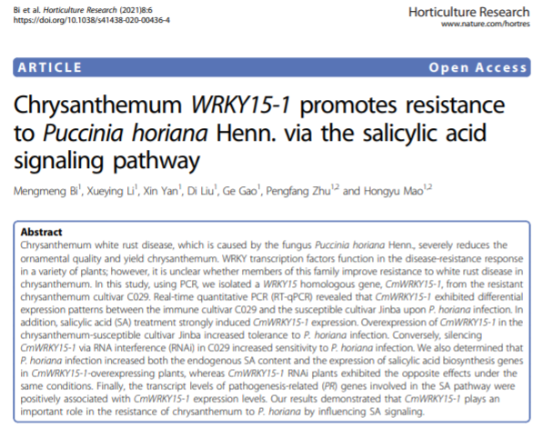 近日,Horticulture Research在线发表了乐动网页登录毛洪玉副教授团队题为Chrysanthemum WRKY15-1 promotes resistance to Puccinia horiana Henn. via the salicylic acid signaling pathway的研究论文。文章中以课题组前期对菊花抗、感品种进行转录组测序获得的差异表达基因CmWRKY15-1为基础,本研究从菊花抗病品种‘C029’中分离得到CmWRKY15-1,发现其在抗、感品种中受病原菌诱导差异表达,并响应水杨酸(salicylicacid,SA)激素诱导。研究结果表明,CmWRKY15-1作为正调控转录因子,通过调节SA信号途径相关基因参与对菊花白色锈病的响应。该研究对于培育菊花抗病品种具有重要的理论和现实意义。