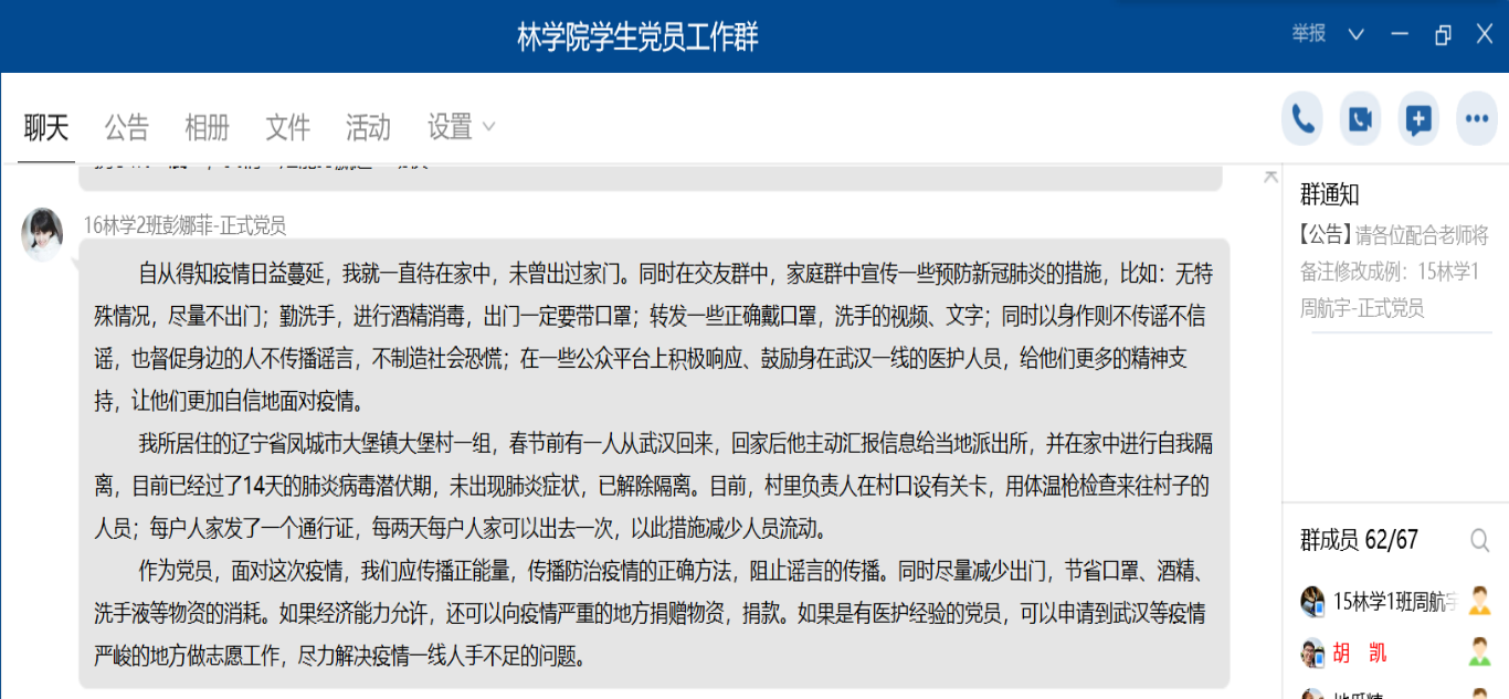 面对严峻的抗疫形势,219日下午2点,林学院本科生党支部借助qq网络平台举行抗击疫情线上主题党日活动,打破时空限制,让党员随时随地实现学习和交流,为将基层党组织在疫情防控阻击战中成为坚强的战斗堡垒,充分发挥共产党员的先锋模范作用打下坚实的思想基础。